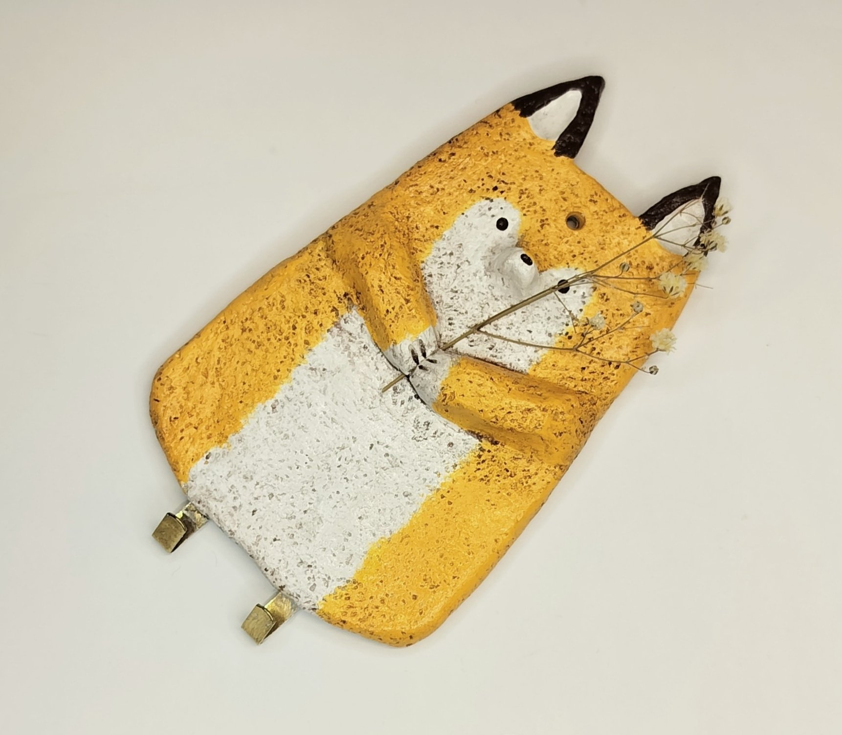 Söpö kettu avainnaulakko, jossa on käpälien välissä reikä, johon voi lisätä kuivakukkia. Koot ja värit voivat vaihdella hieman, koska jokainen kappale on käsintehty ja uniikki. Seinäkiinnitykseen suositellaan pientä, noin 5 mm:n ruuvia.