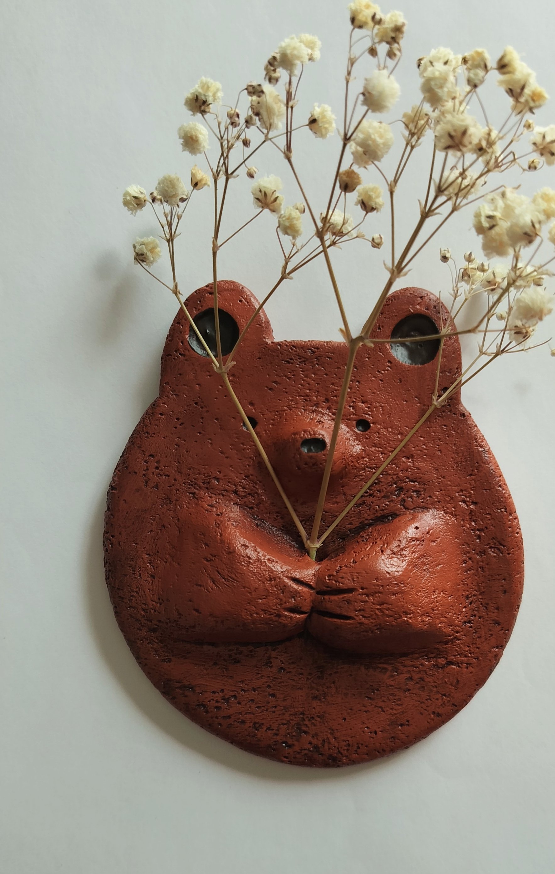 Söpö savikarhu, jolla on reikä käpälien välissä, johon voi lisätä kuivakukkia. Koot ja värit voivat vaihdella hieman, koska jokainen kappale on tehty käsin ja on ainutlaatuinen. Takana on koukku seinäkiinnitystä varten.