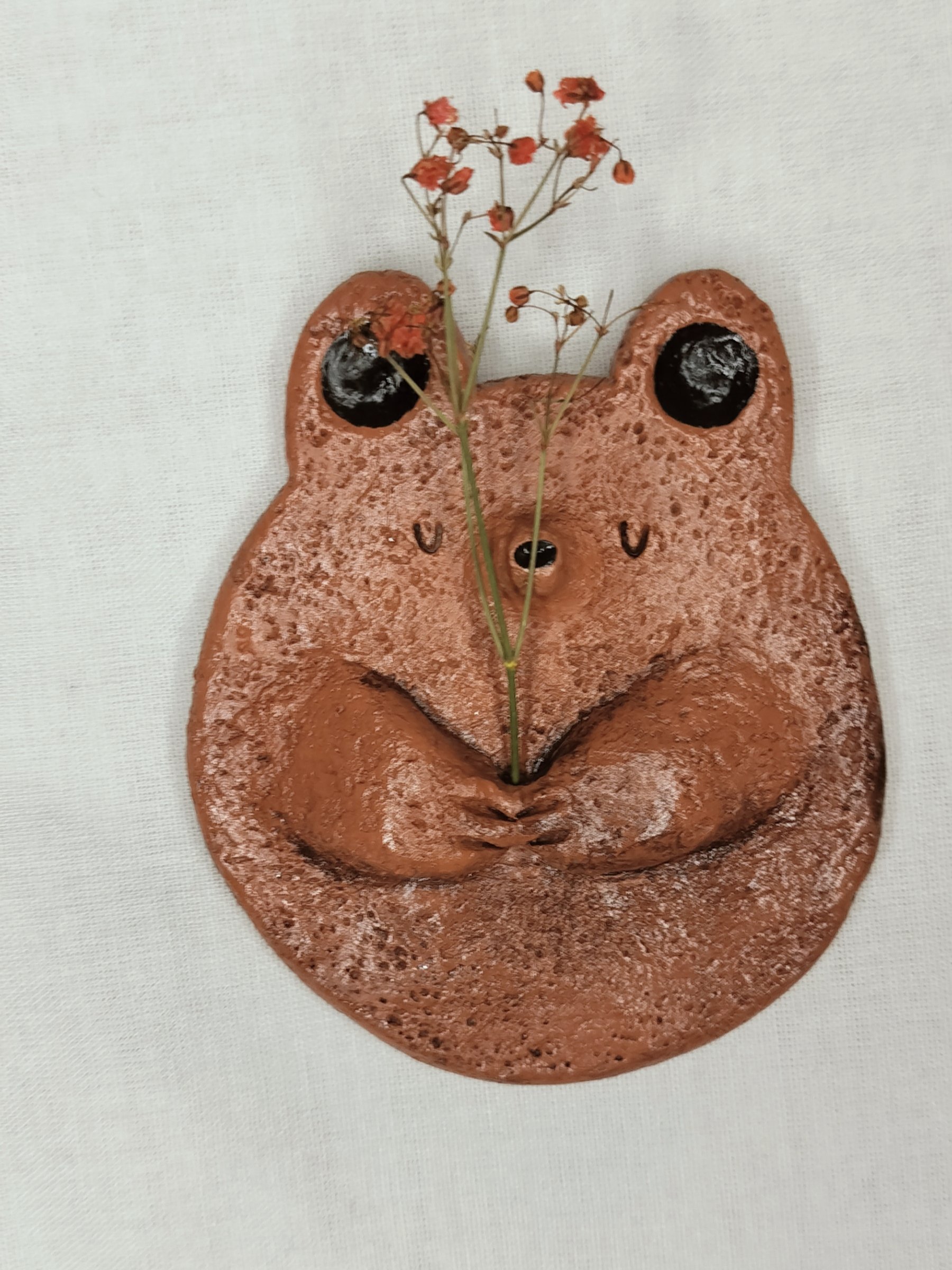 Söpö savikarhu, jolla on reikä käpälien välissä, johon voi lisätä kuivakukkia. Koot ja värit voivat vaihdella hieman, koska jokainen kappale on tehty käsin ja on ainutlaatuinen. Takana on koukku seinäkiinnitystä varten. 10 x 8 cm