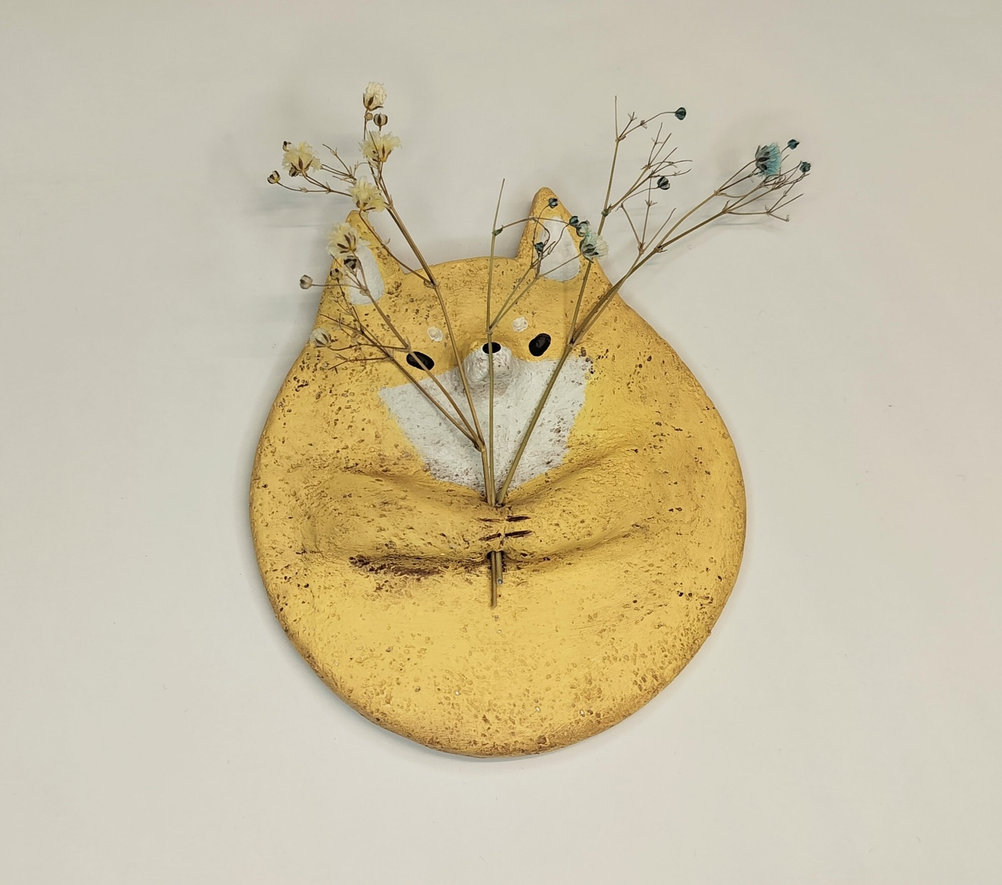 Söpö koira, jolla on reikä tassujen välissä, johon voi lisätä kuivakukkia. Koot ja värit voivat vaihdella hieman, koska jokainen kappale on tehty käsin ja on ainutlaatuinen. Takana on koukku seinäkiinnitystä varten.