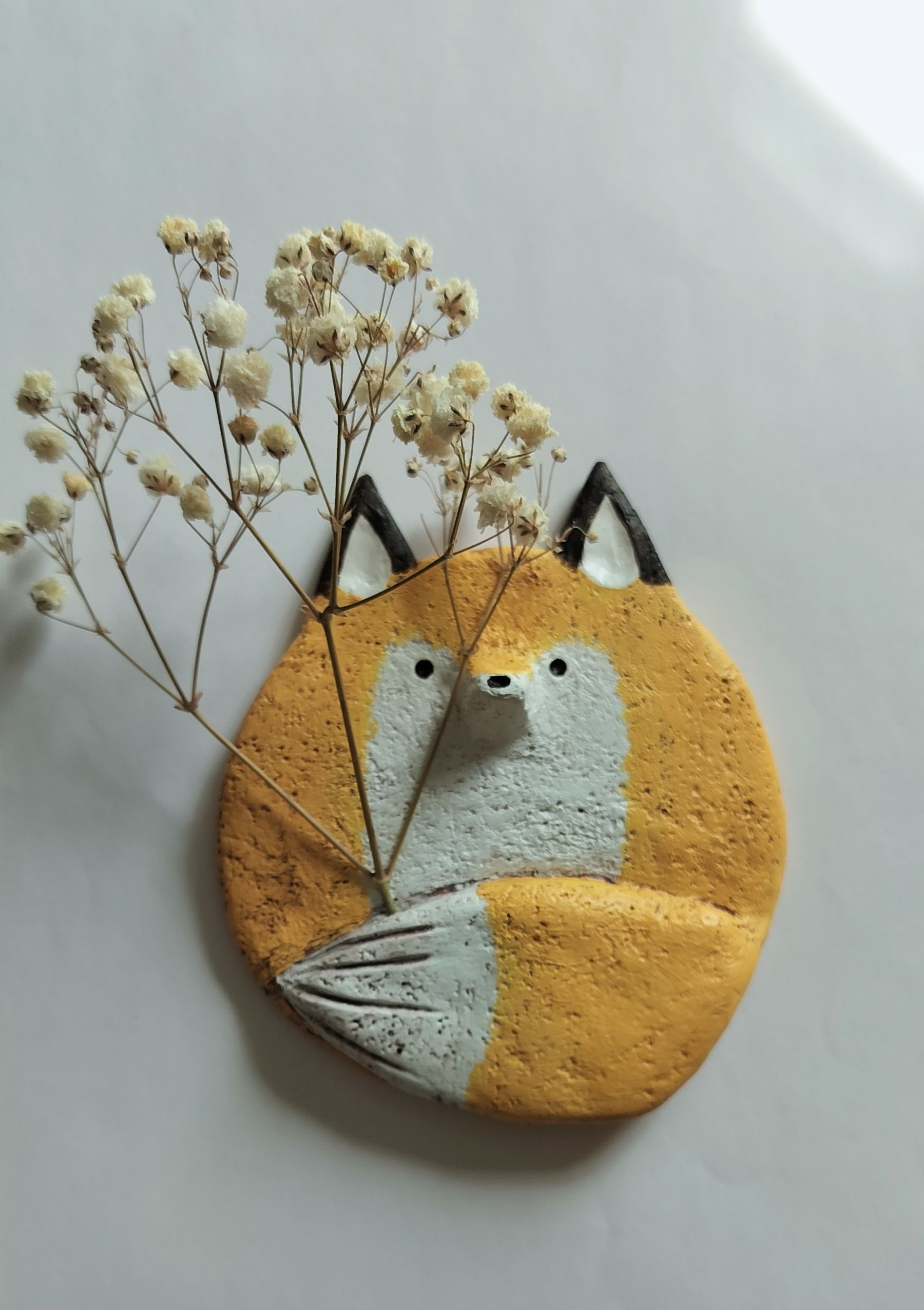 Söpö kettu, jolla on reikä hännässä, johon voi lisätä kuivakukkia. Koot ja värit voivat vaihdella hieman, koska jokainen kappale on tehty käsin ja on ainutlaatuinen. Takana on koukku seinäkiinnitystä varten.