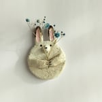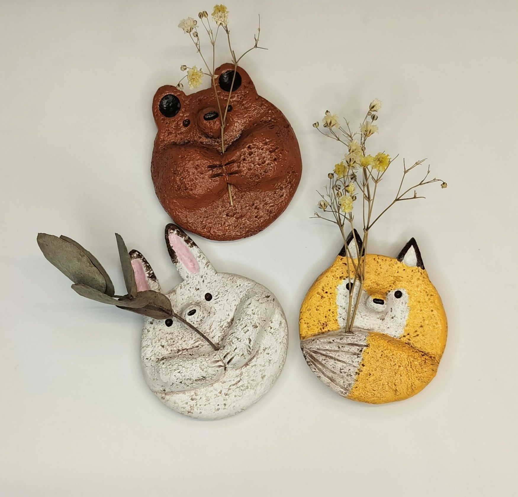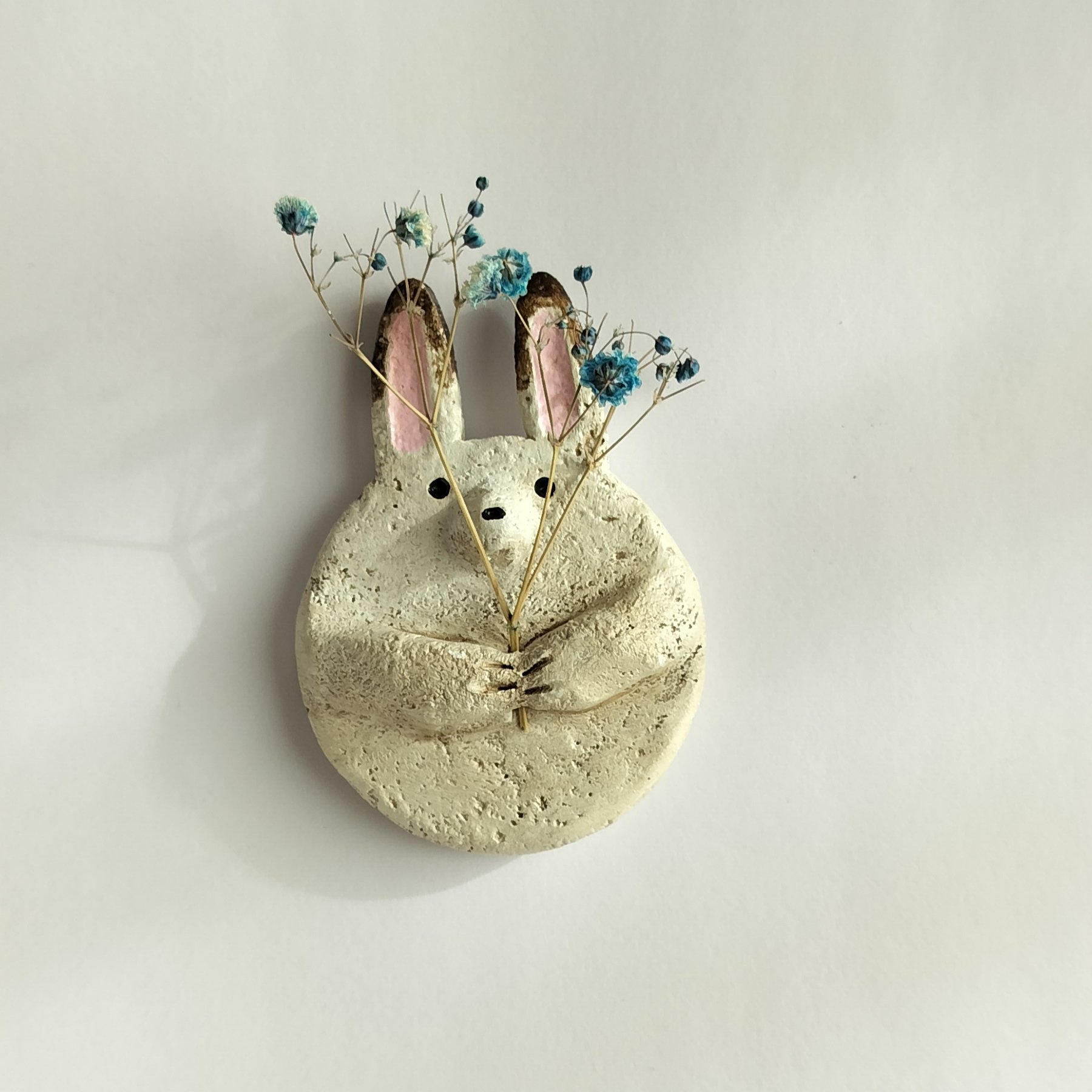 Söpö savieläinmagneetti, jolla on reikä käsien välissä tai hännässä, johon voi lisätä kuivattuja kukkia. Koot ja värit voivat vaihdella hieman, koska jokainen kappale on käsintehty ja ainutlaatuinen.