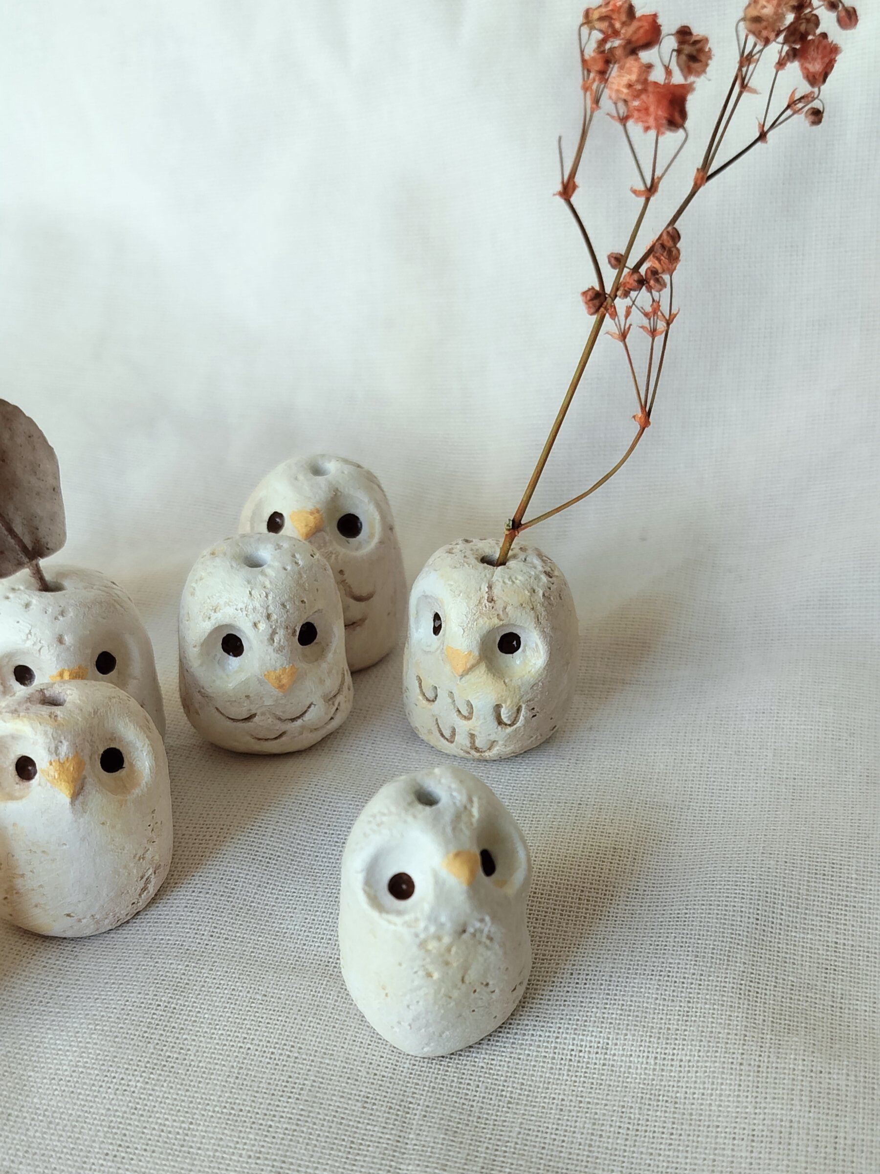Pieniä savesta tehtyjä eläinmaljakoita kuivakukille. Jokainen kappale on ainutlaatuinen ja käsintehty, joten värit ja koot voivat vaihdella.