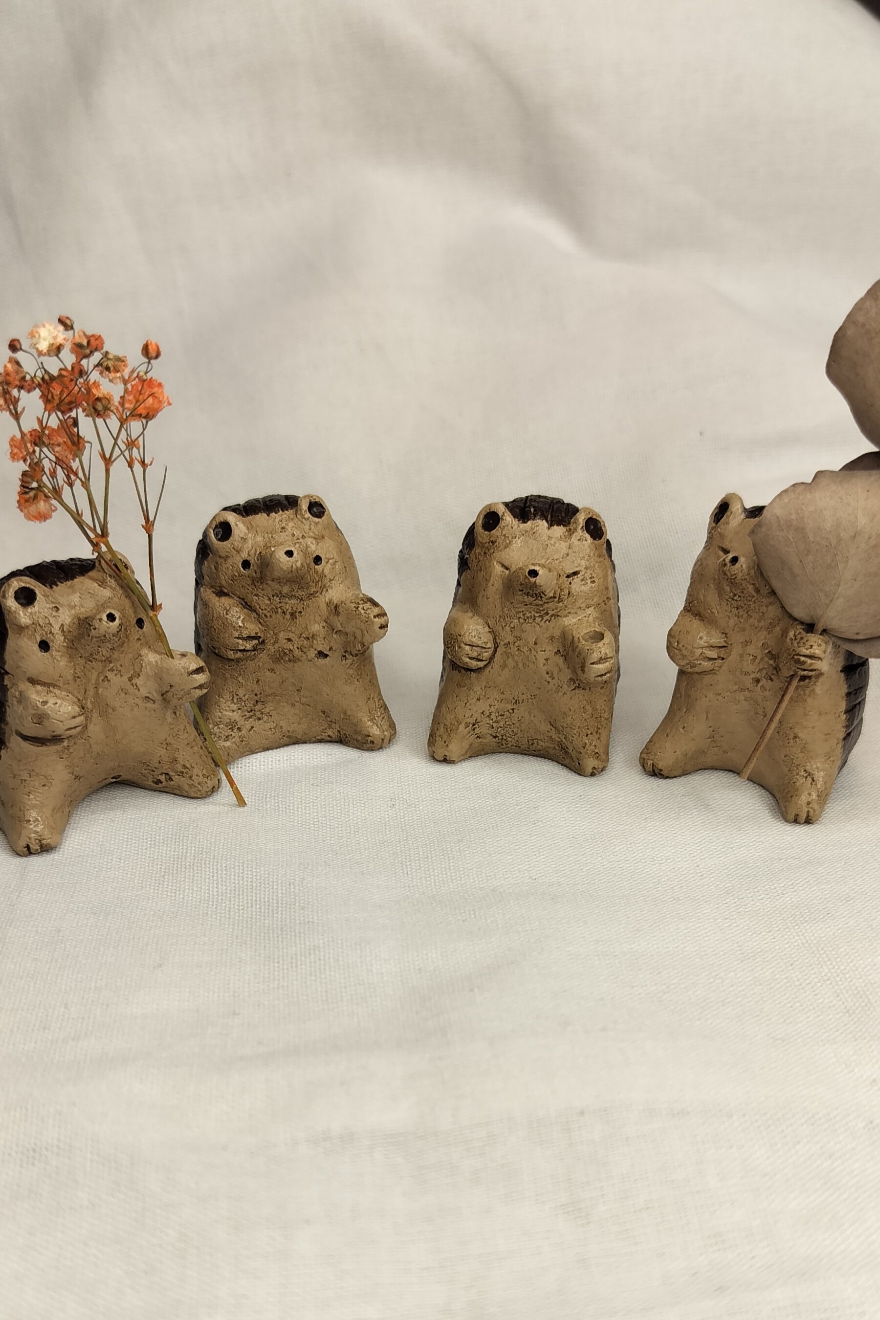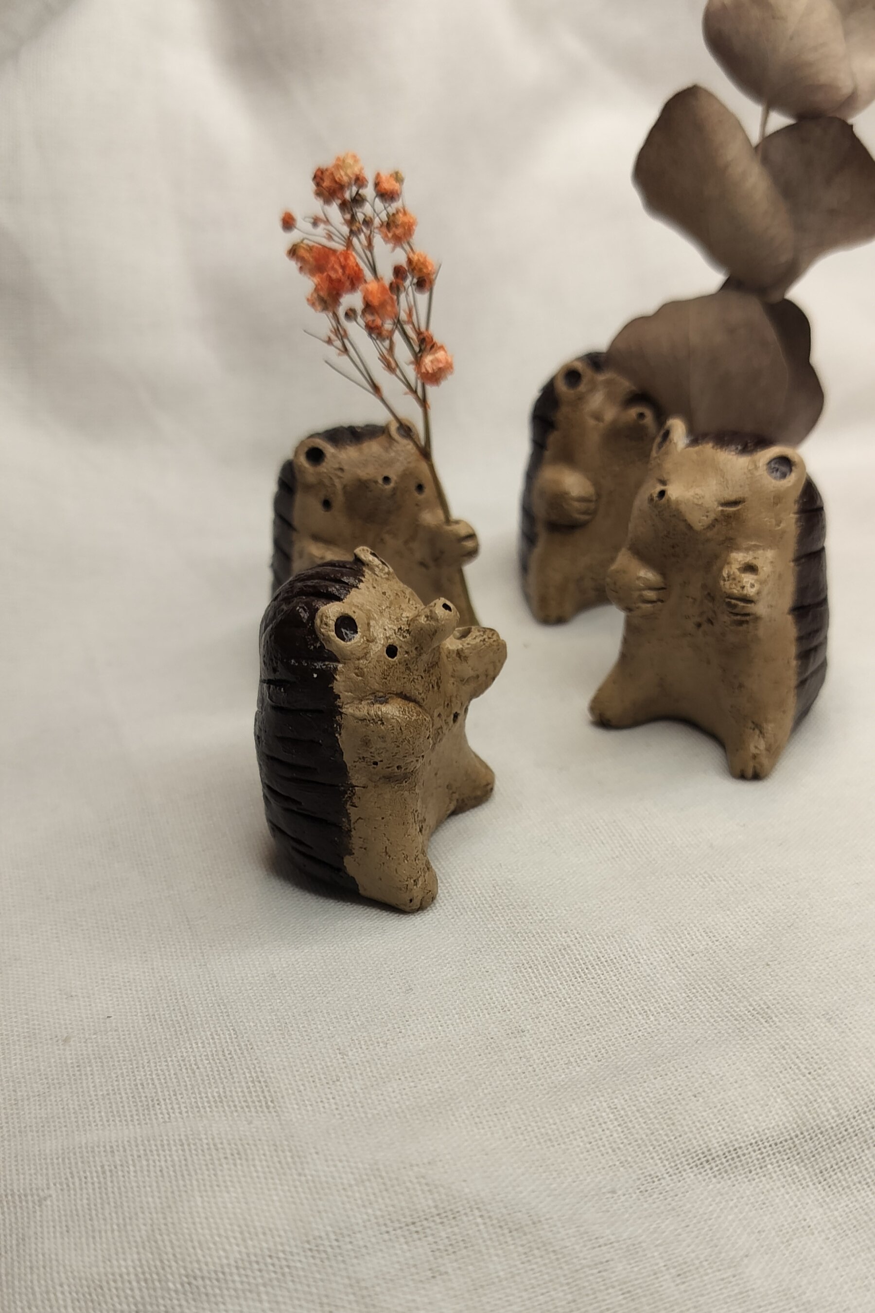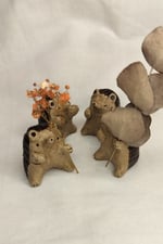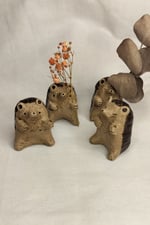 Pieniä savesta tehtyjä eläinmaljakoita kuivakukille. Jokainen kappale on ainutlaatuinen ja käsintehty, joten värit ja koot voivat vaihdella.