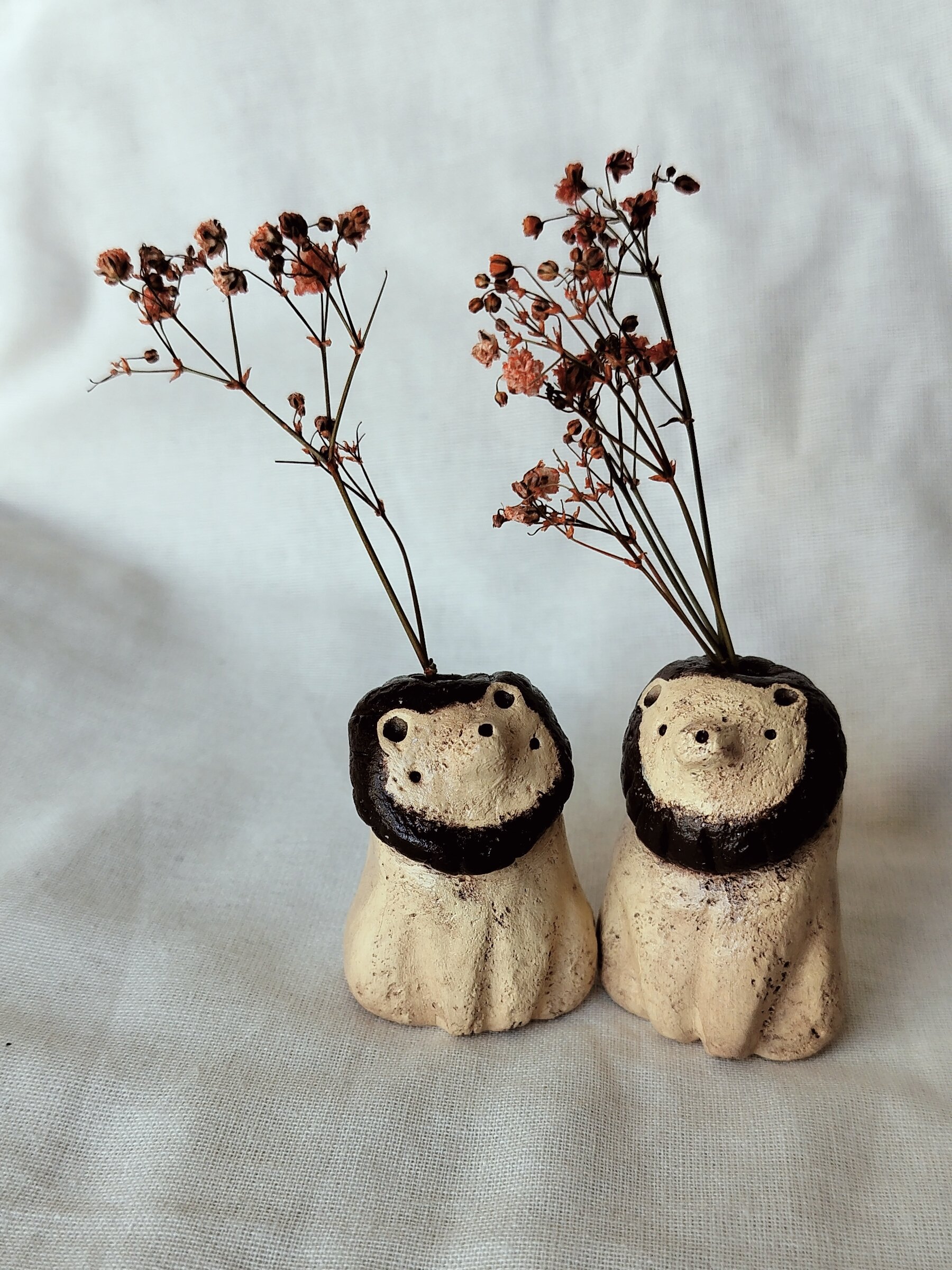 Pieniä savesta tehtyjä eläinmaljakoita kuivakukille. Jokainen kappale on ainutlaatuinen ja käsintehty, joten värit ja koot voivat vaihdella.