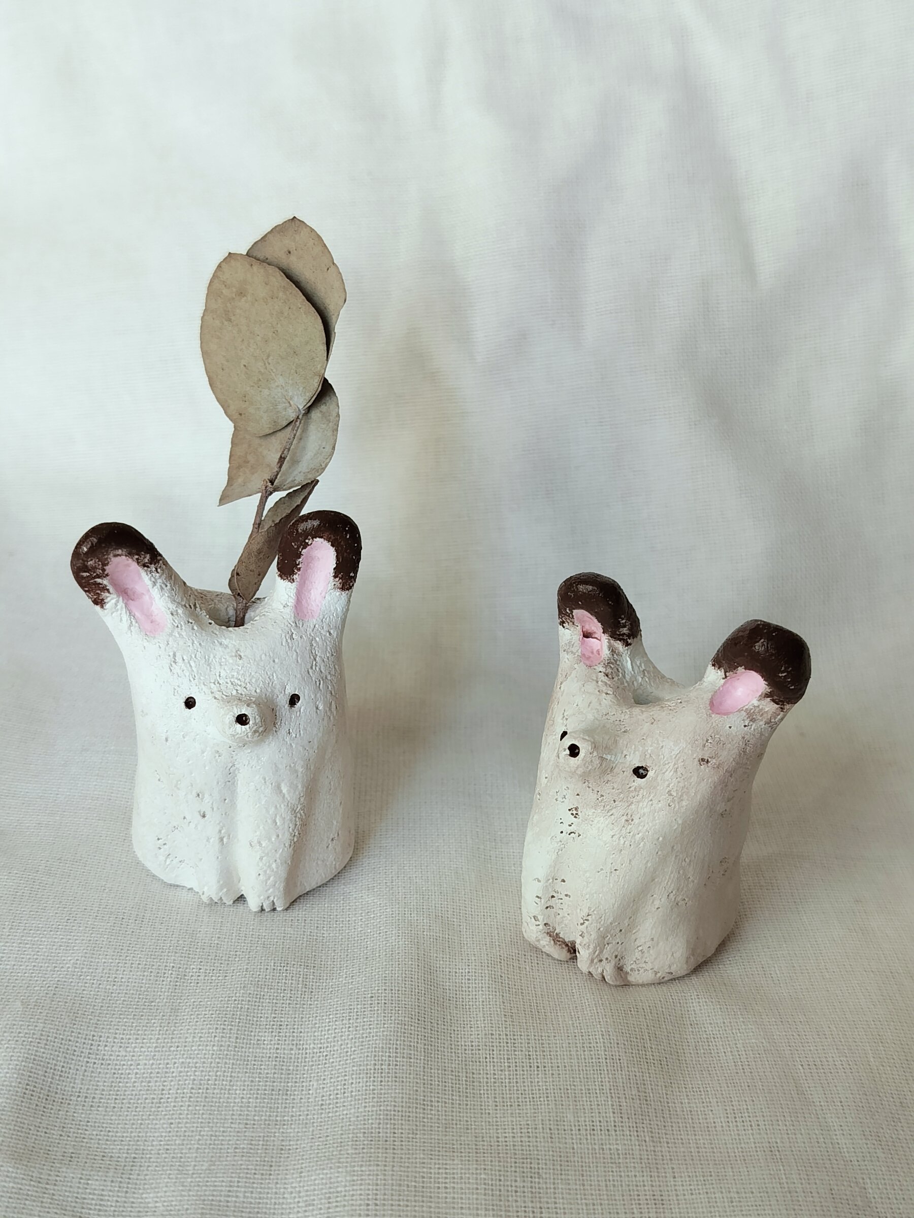 Pieniä savesta tehtyjä eläinmaljakoita kuivakukille. Jokainen kappale on ainutlaatuinen ja käsintehty, joten värit ja koot voivat vaihdella.