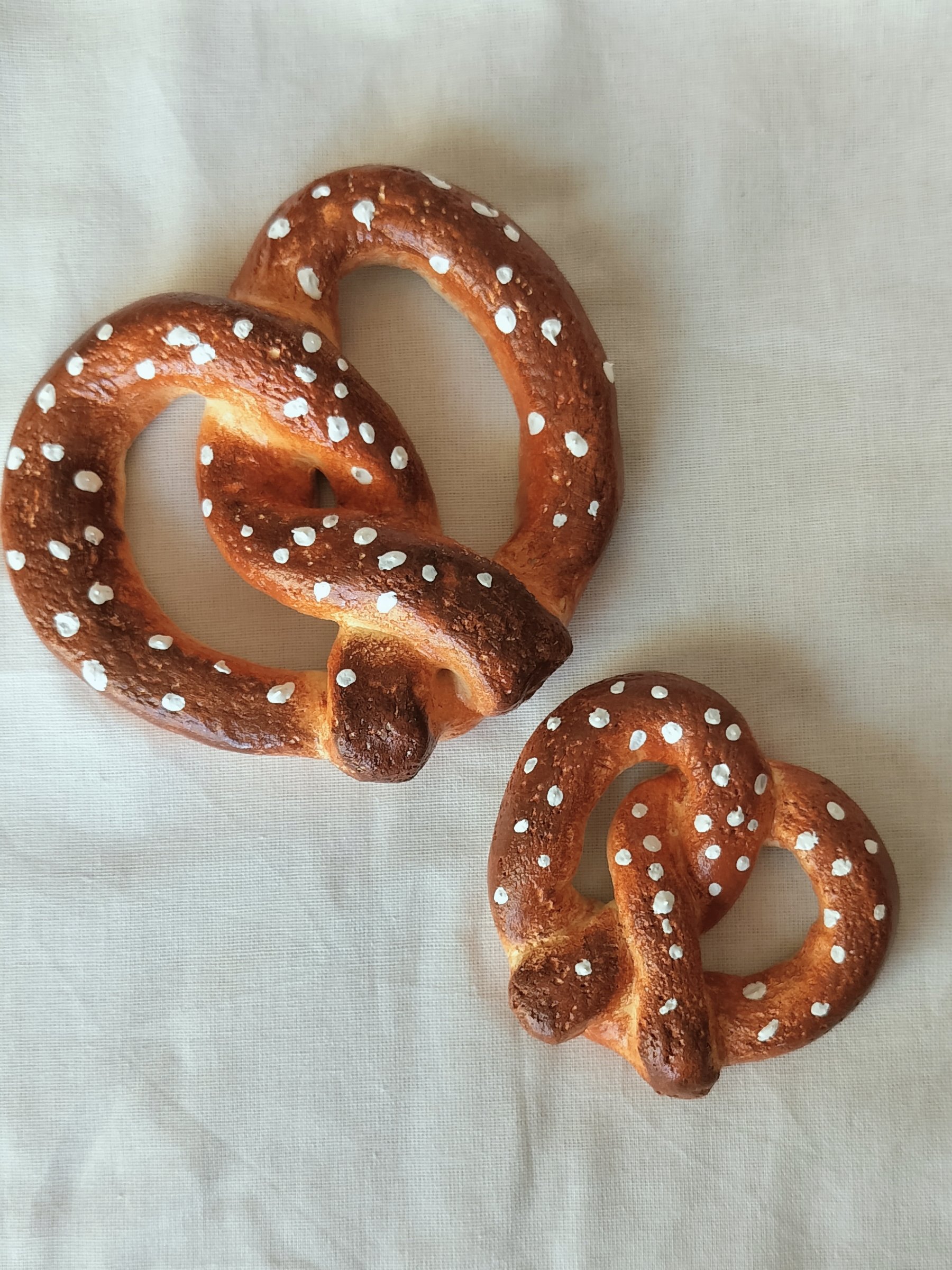 Hauska savesta tehty pretzel. Takana koukku seinäkiinnitystä varten.