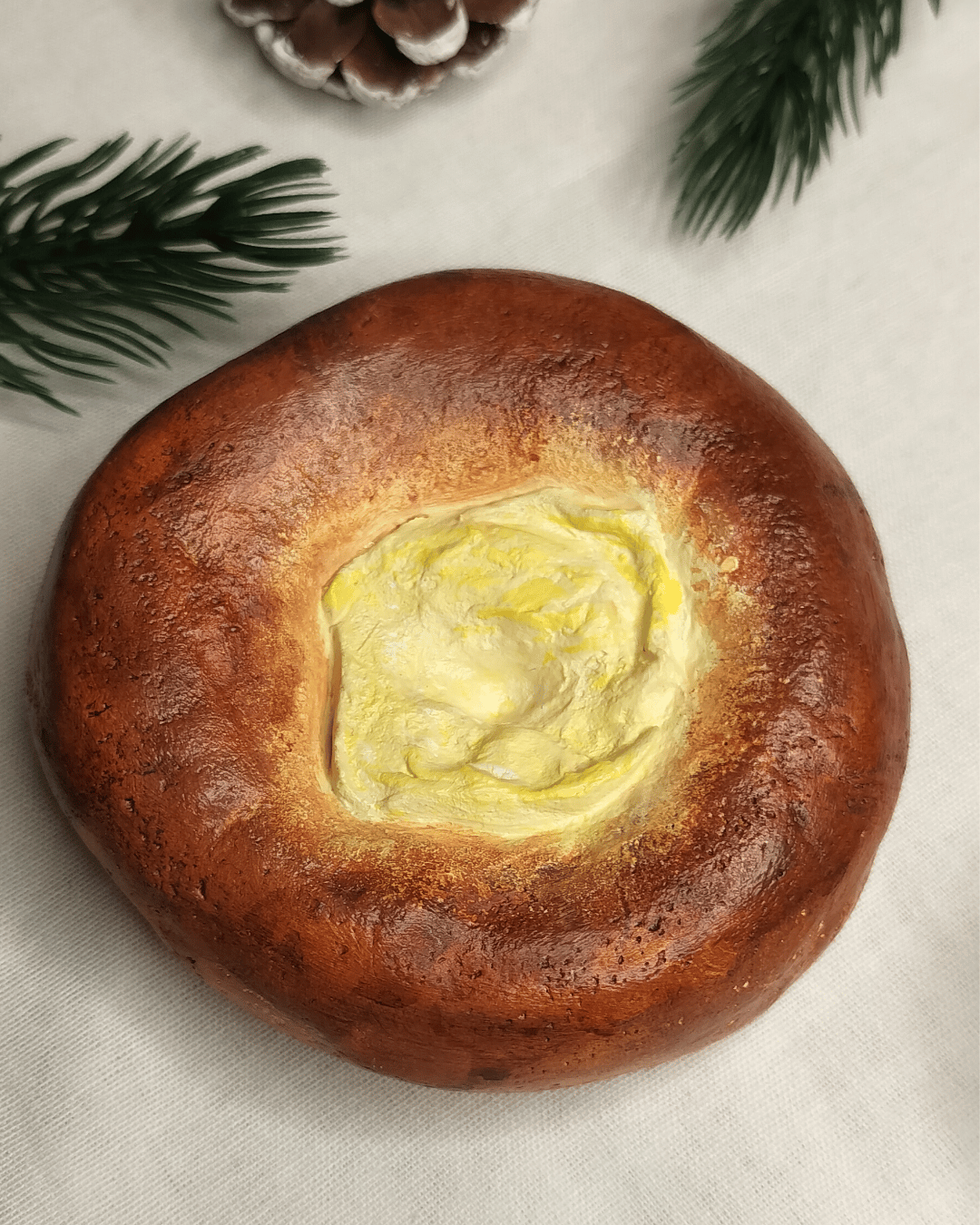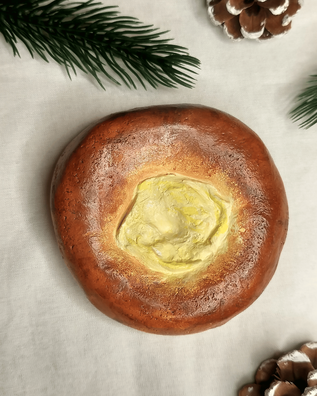 Hauska savesta tehty voisilmäpulla. Takana koukku seinäkiinnitystä varten.