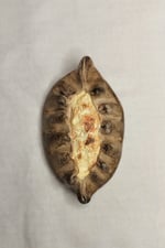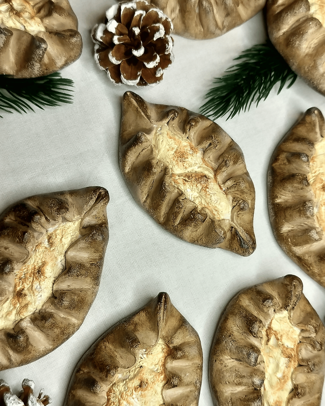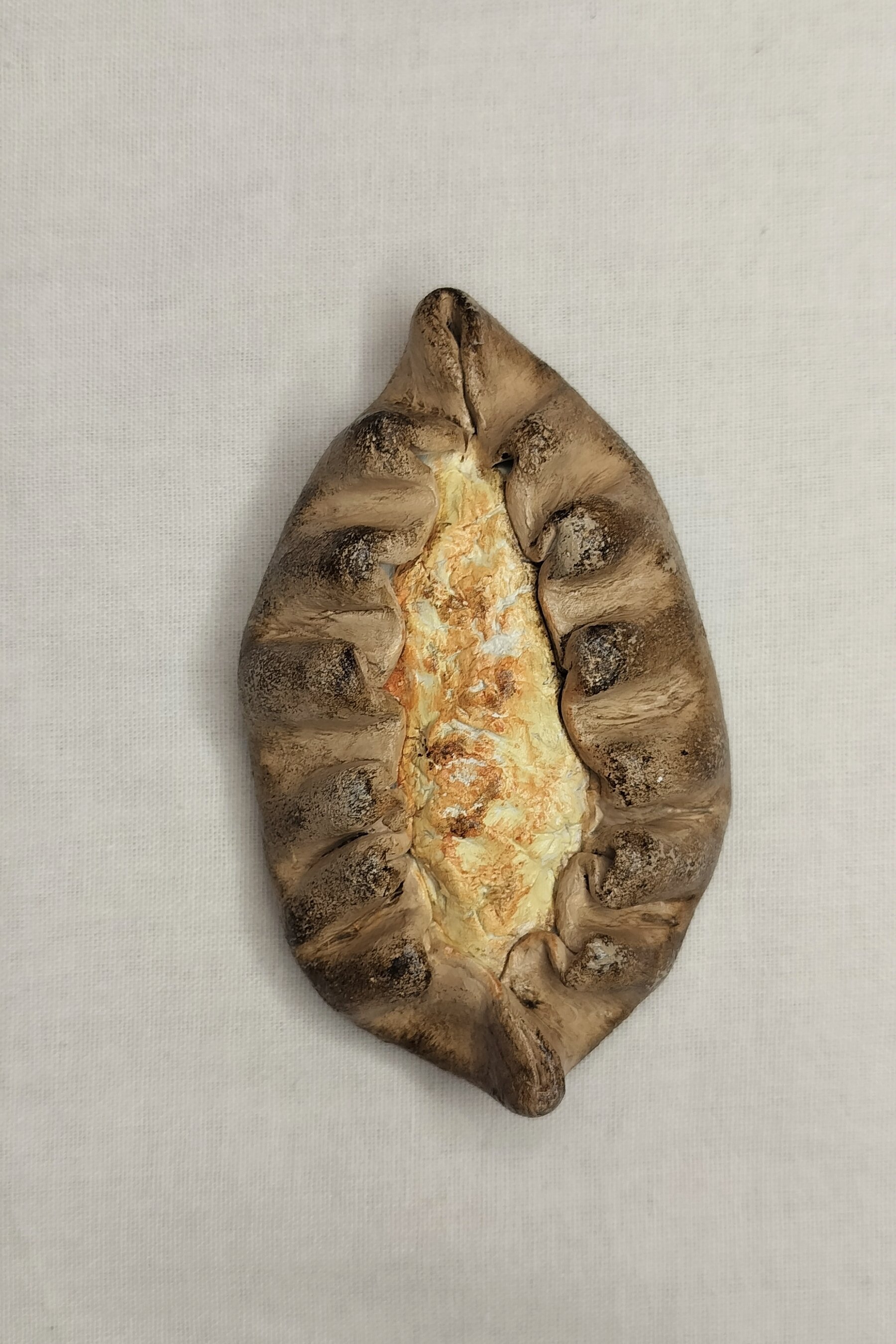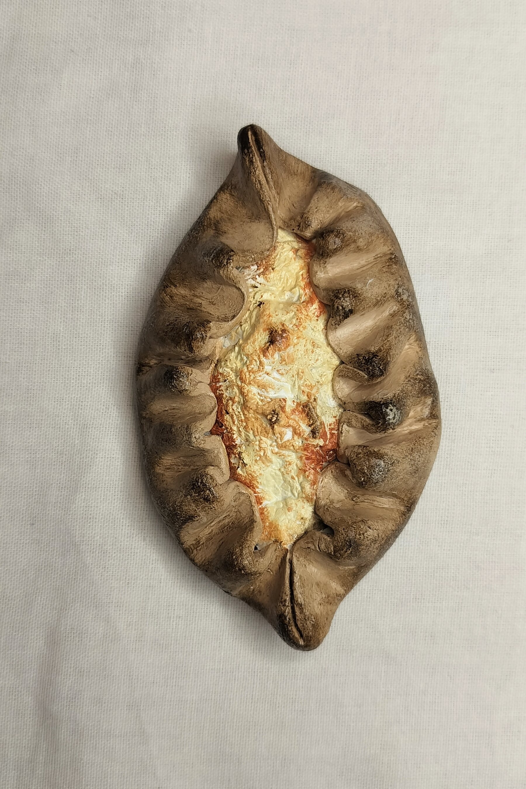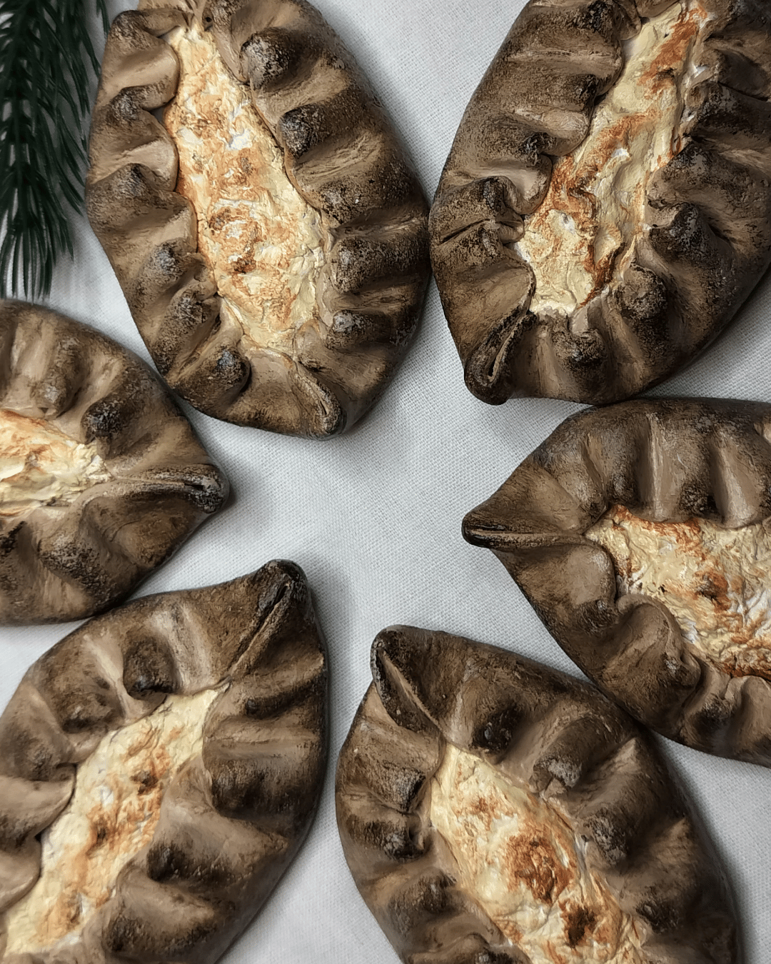 Hauska savesta tehty karjalanpiirakka. Takana koukku seinäkiinnitystä varten.