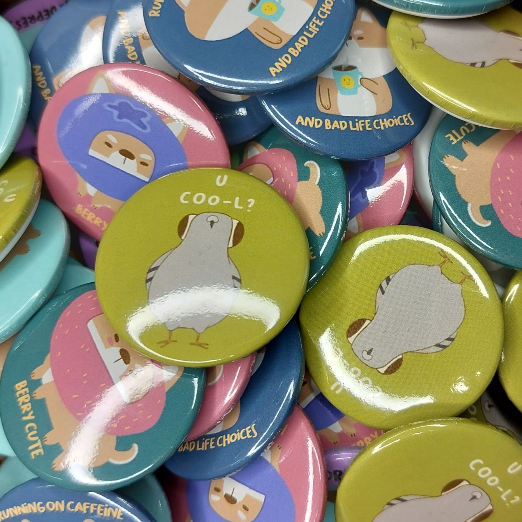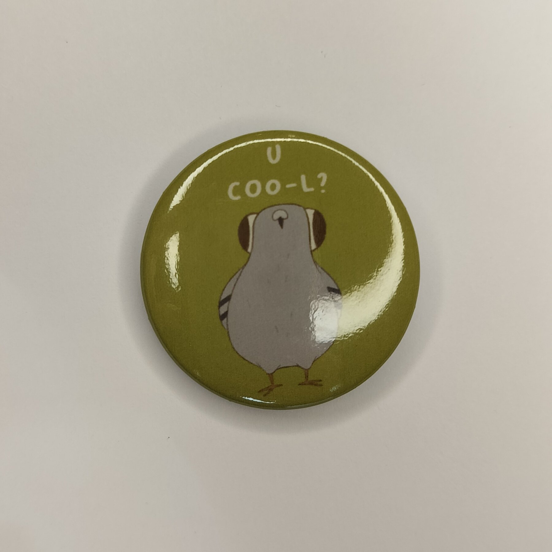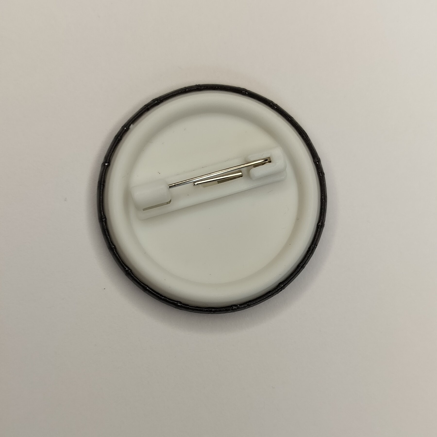 Pyöreä pinssi, tausta muovia ja kiinnitys neulalla, halkaisija 3,7 cm
