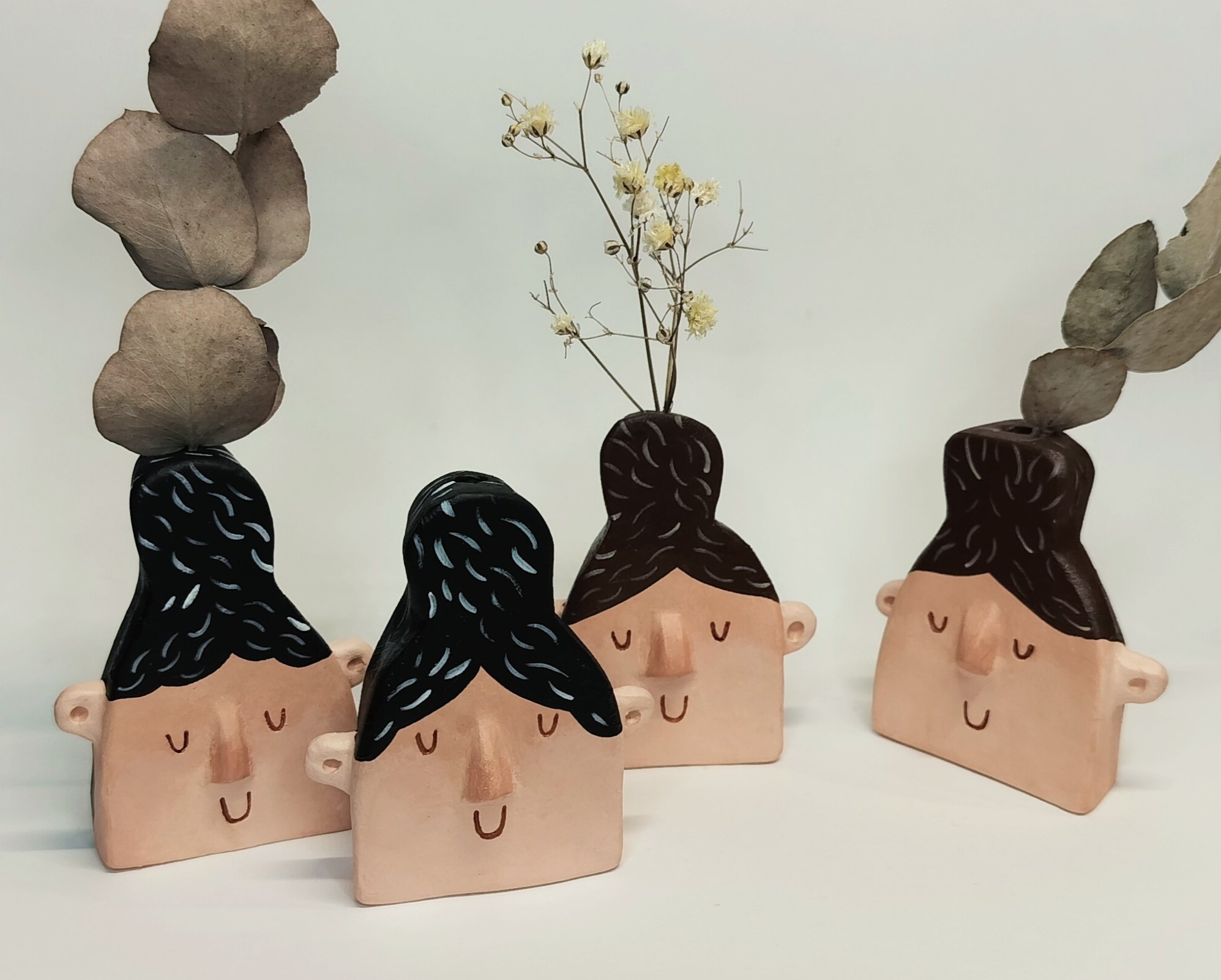 Pieniä savesta tehtyjä maljakoita kuivakukille. Jokainen kappale on ainutlaatuinen ja käsintehty, joten värit ja koot voivat vaihdella.